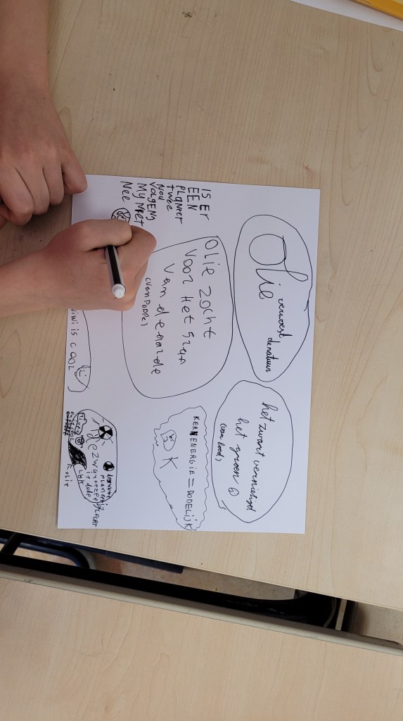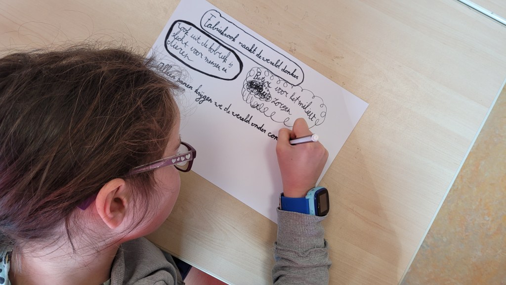 Bij deze poster bedachten de kinderen bijvoorbeeld de volgende zinnen: “Als je een boom kapt, moet je een nieuwe boom planten!”, “Is er een planeet B? Nou, volgens mij niet nee!”