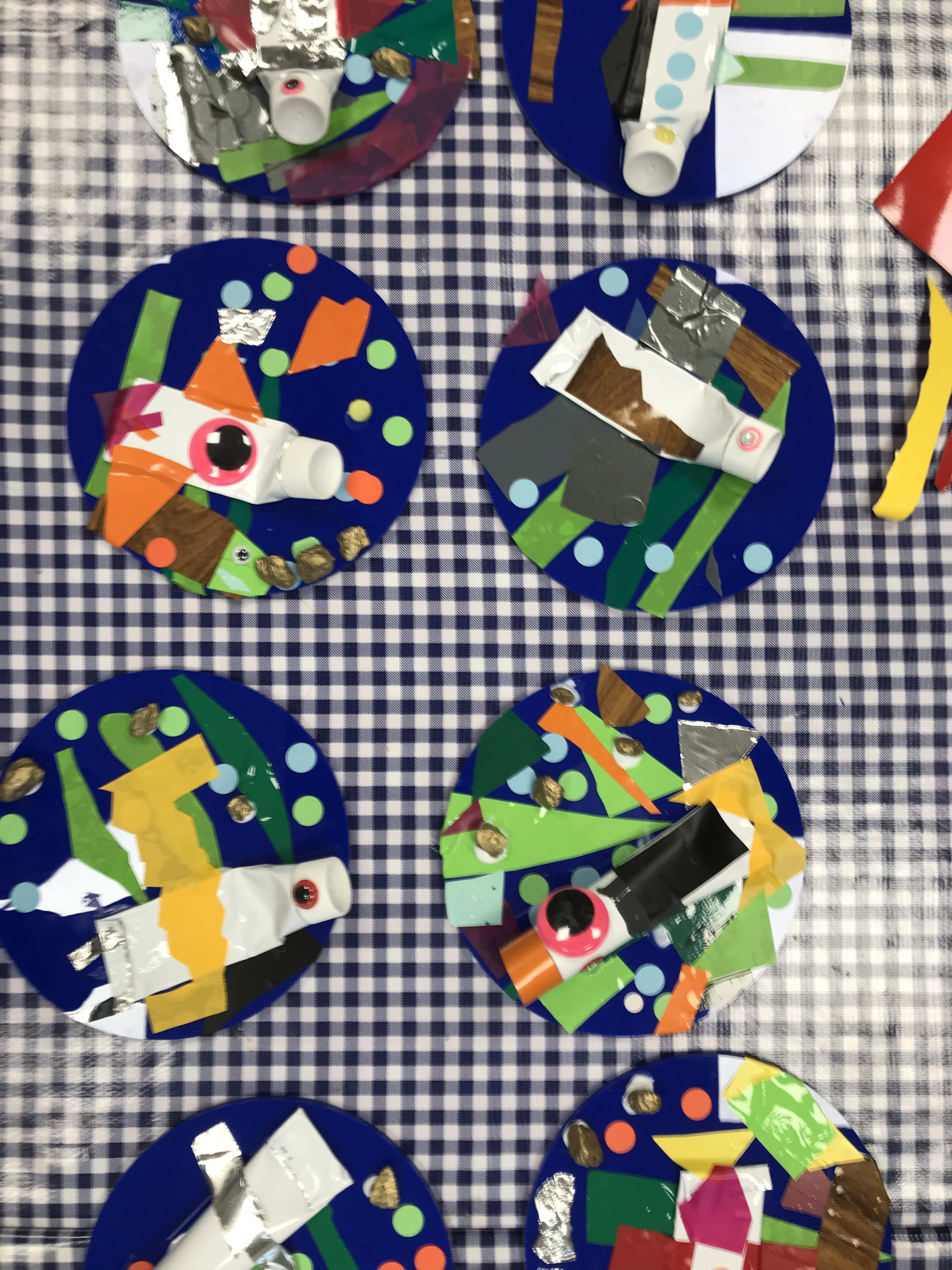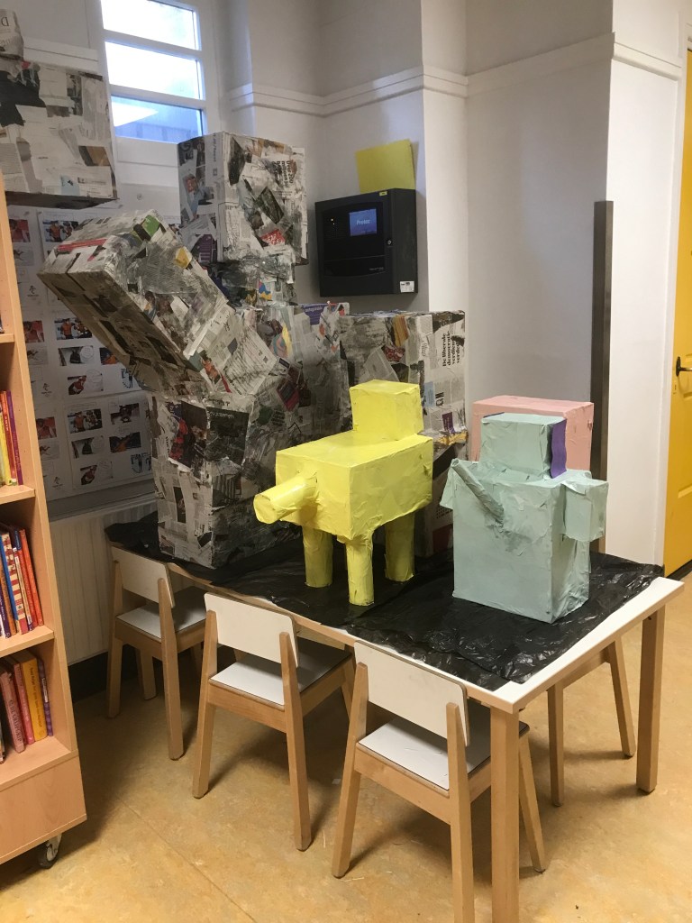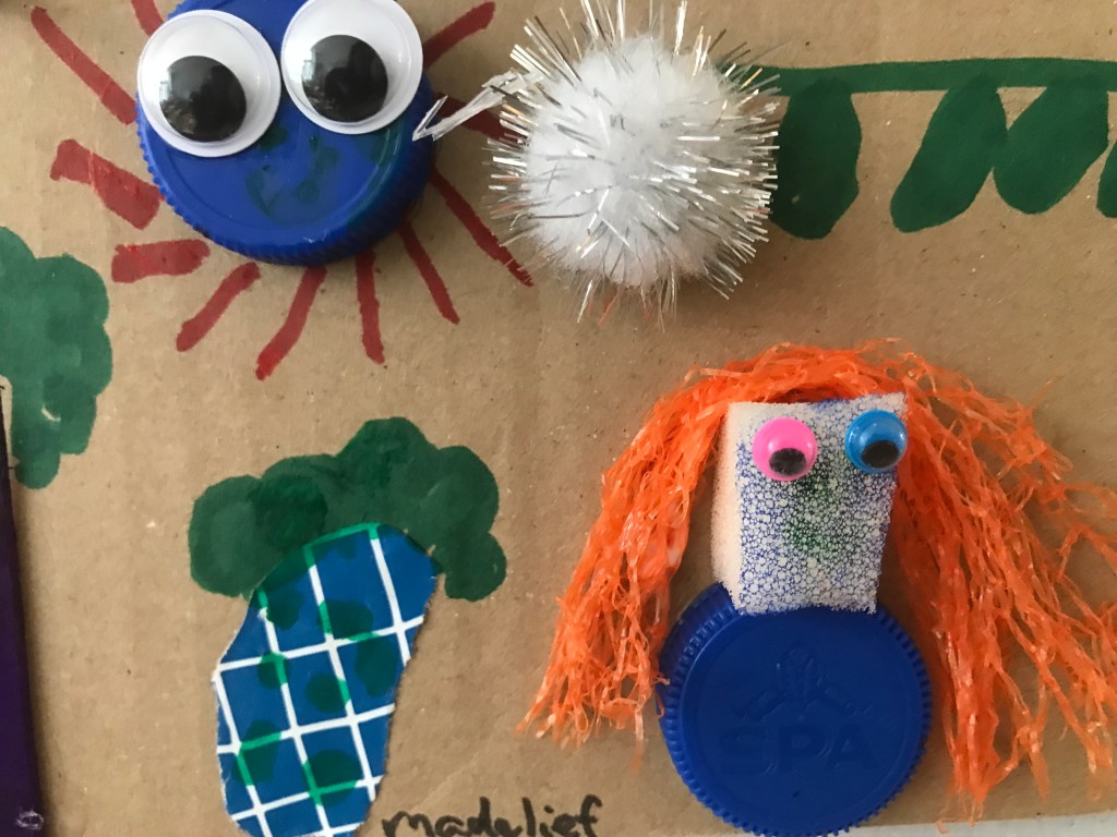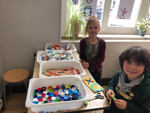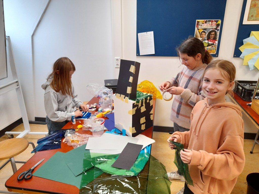 In het kleuteratelier ging 1/2D vandaag aan de slag methode tubes, plastic afval en oud stickermateriaal. Lekker veel peuteren, knippen en plakken, maar het resultaatmag er zijn! Komende maken we er nog een hangertje aan, zodat ze straks mooi kunnen hangen in ons Recyclemuseum over 2 weken.