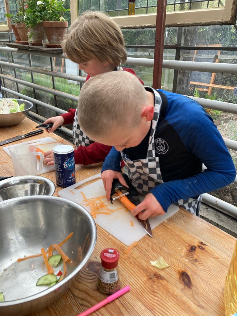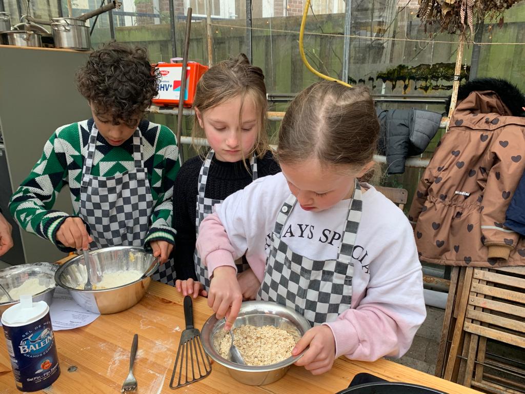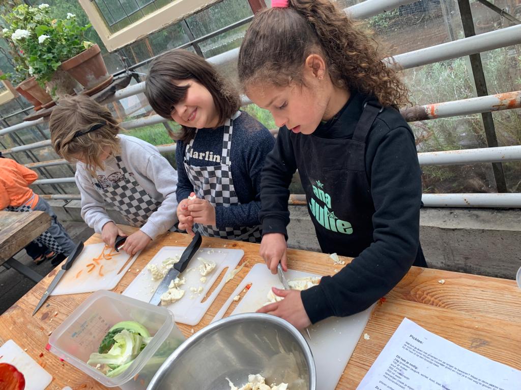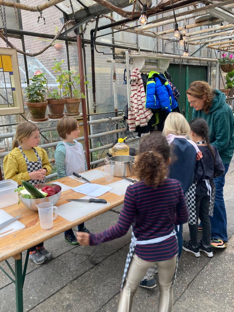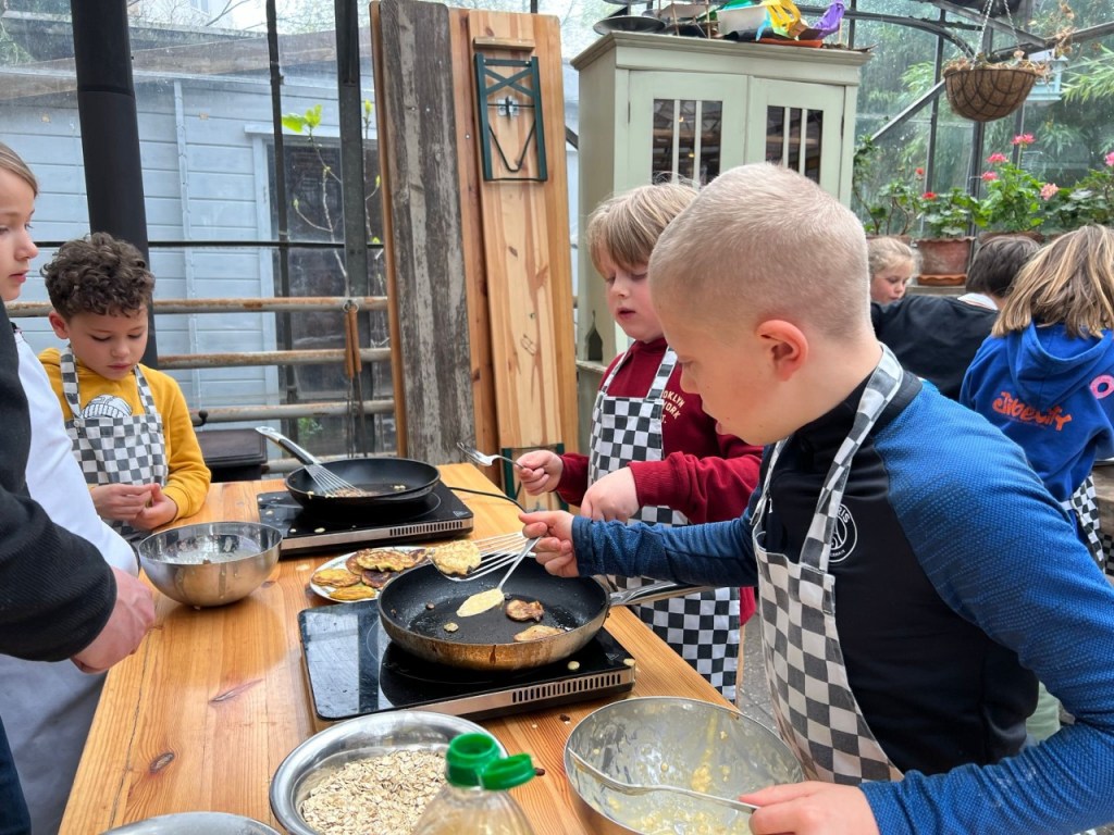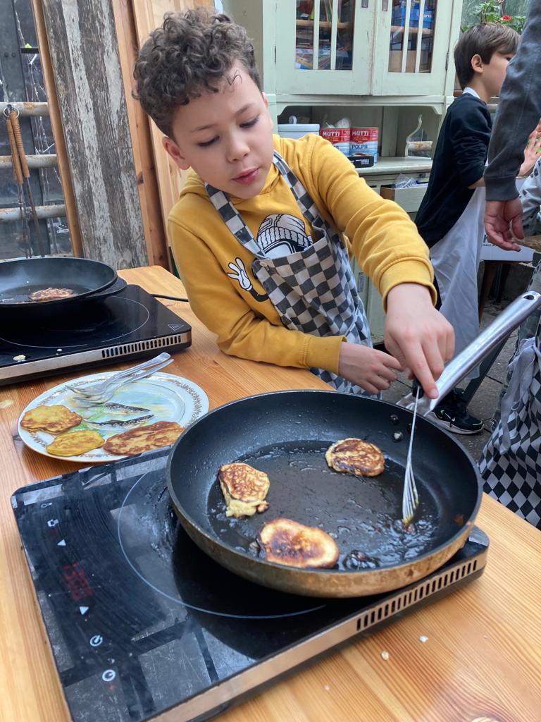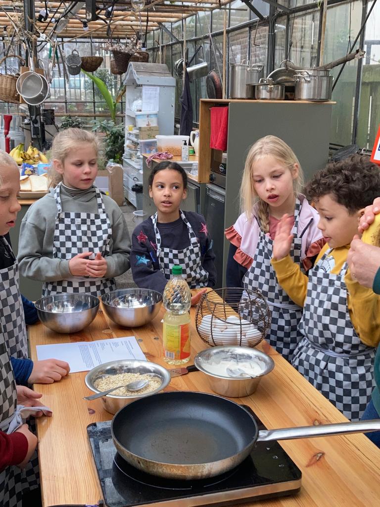 5B ging koken in Kas Keerweer, bij juf Hiske! Bananenpannekoekjes, kruidige croutons en een pickles van groenten. Jammie! De recepten gaan straks in het Kliekjeskookboek van de klas!