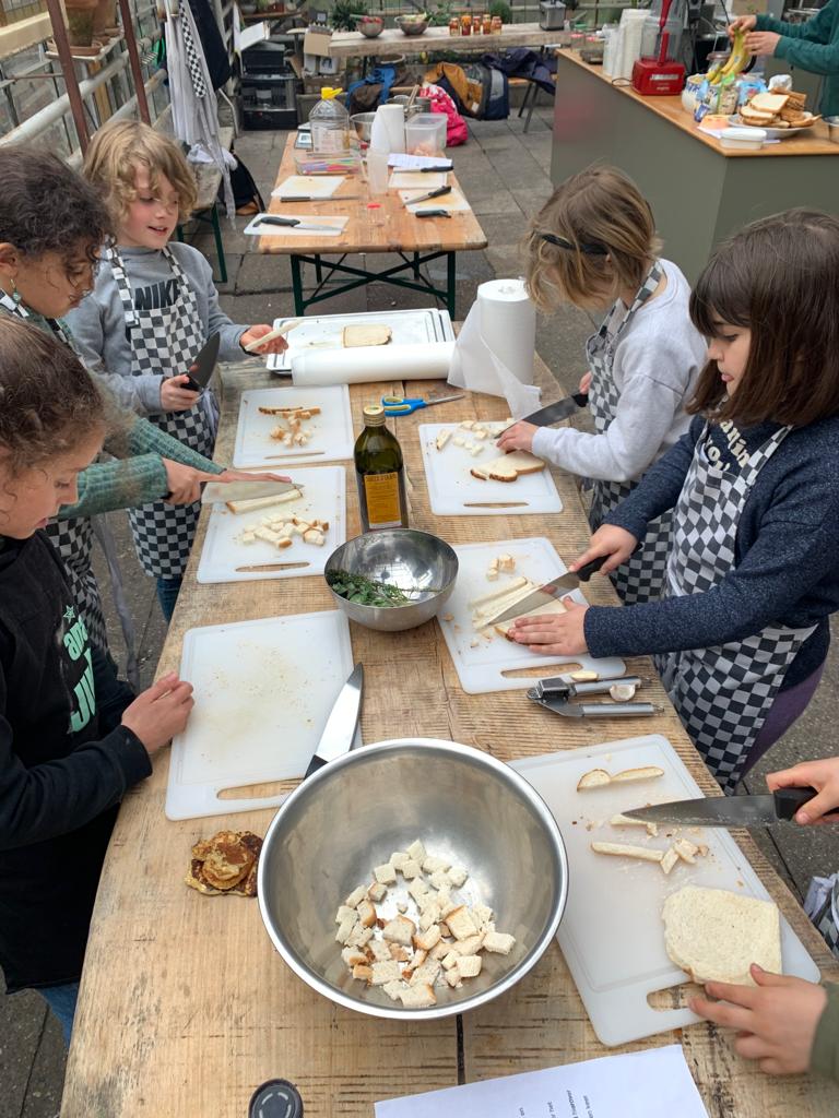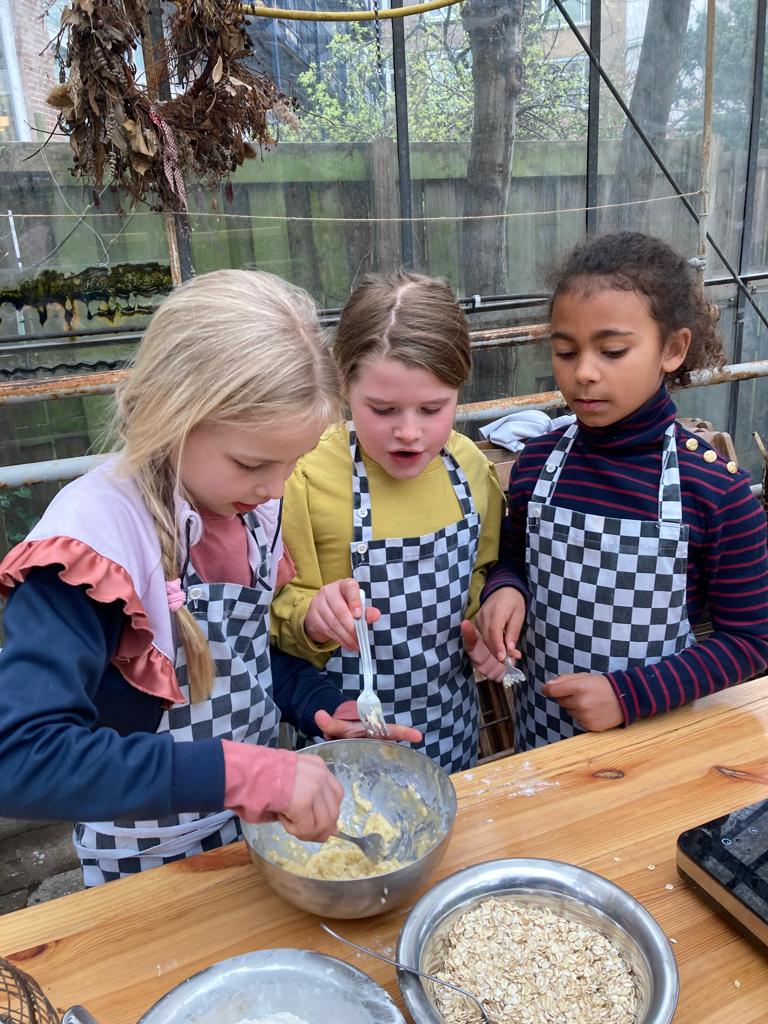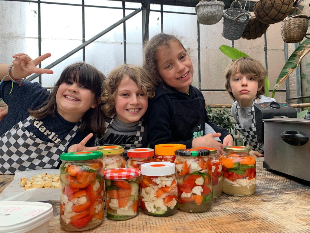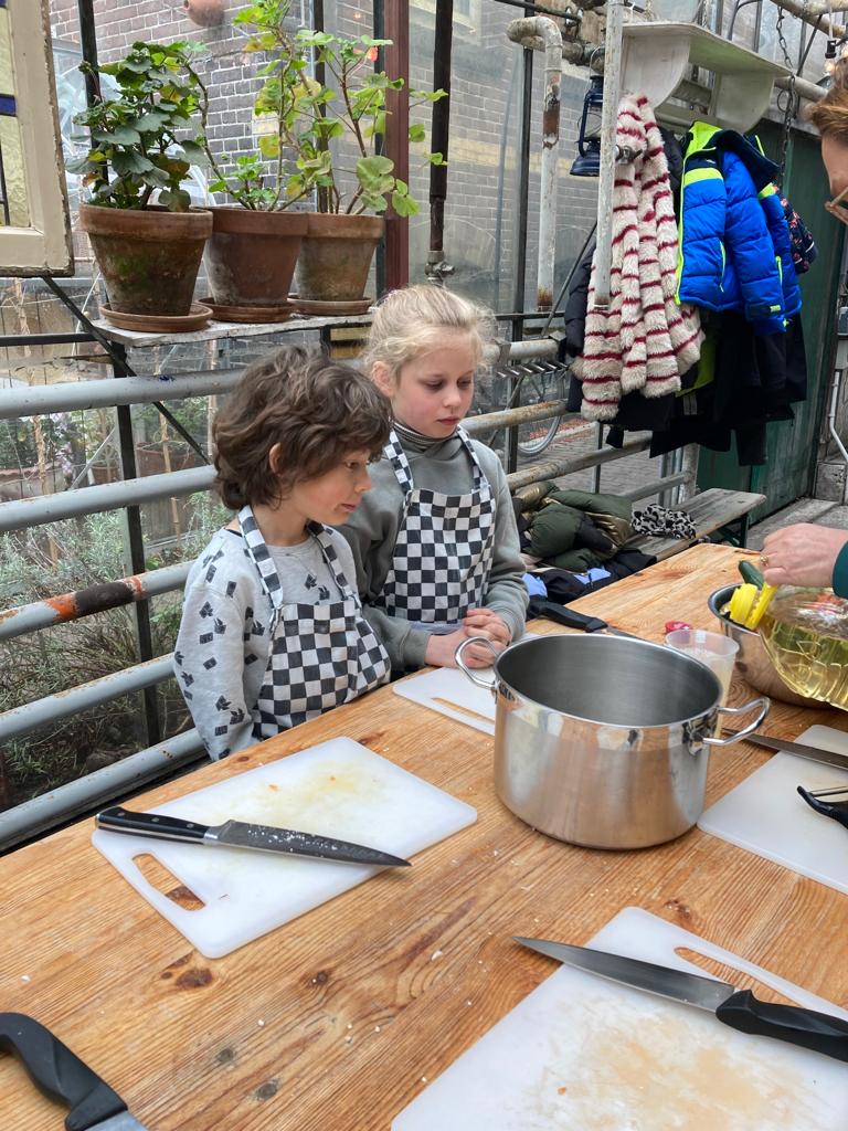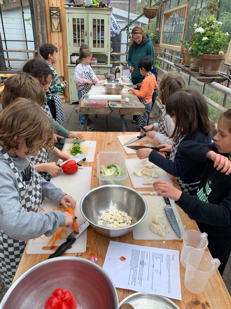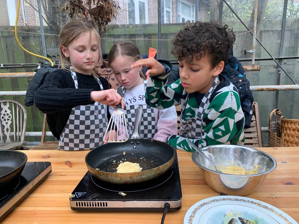 5B ging koken in Kas Keerweer, bij juf Hiske! Bananenpannekoekjes, kruidige croutons en een pickles van groenten. Jammie! De recepten gaan straks in het Kliekjeskookboek van de klas!