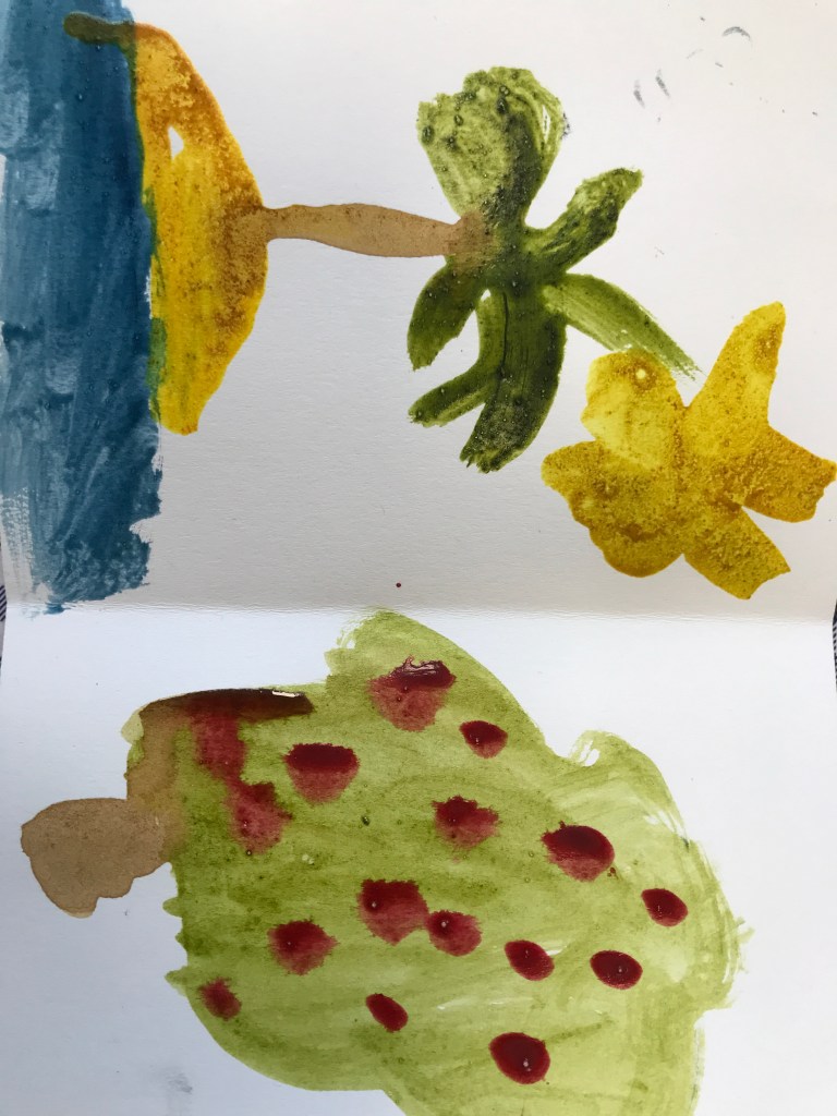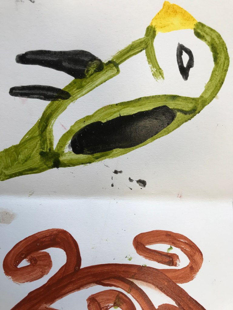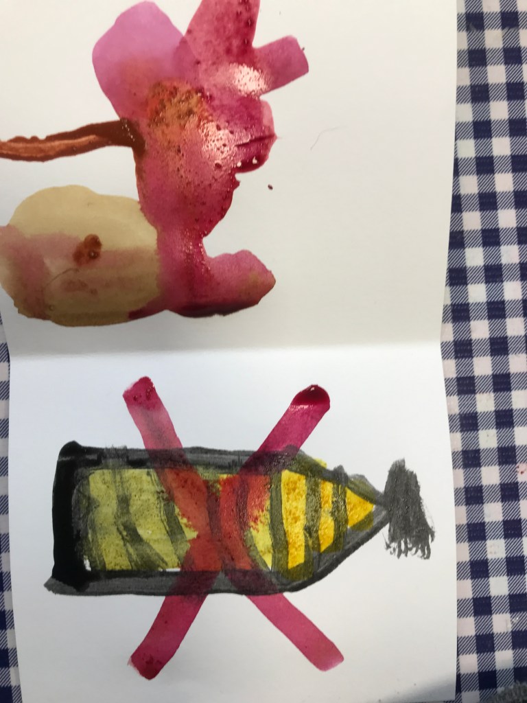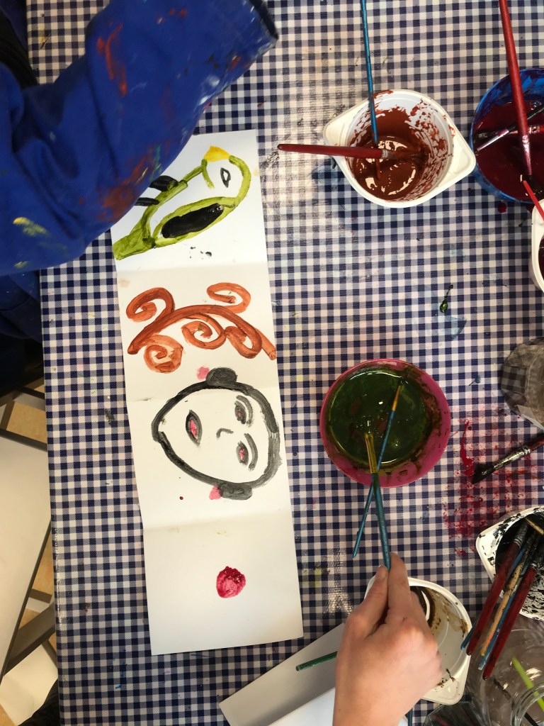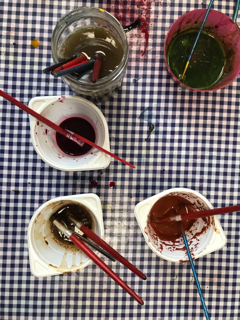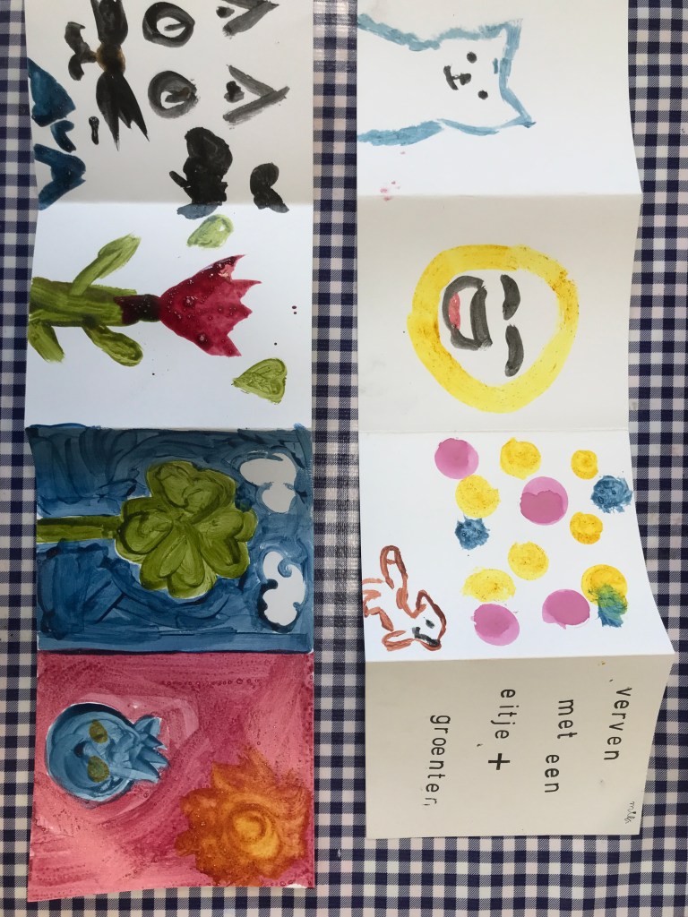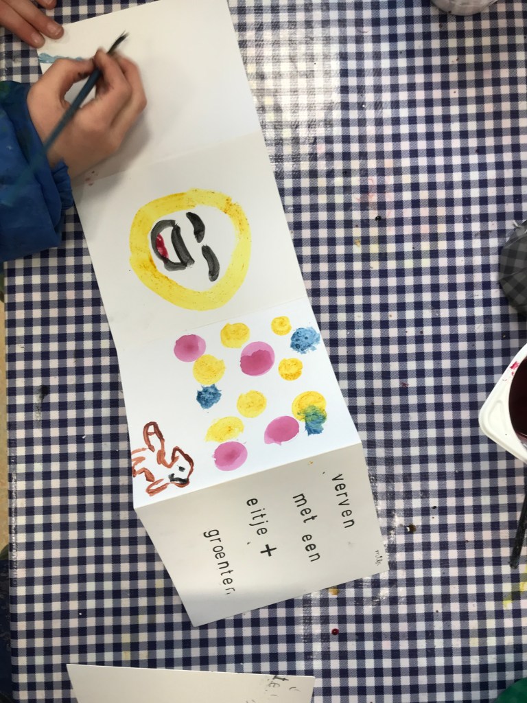 5a verzamelde uien- en avocadoschillen. Vanmiddag werden er heuse natuurlijke verfbadjes van gemaakt in het textielcircuit. Ook werden er servetten geknoopt voor een tie-dye en we maakten zelf verf met een eitje! Met eigeel, wat druppels water en natuurlijke pigmenten werden de mooiste kleuren getoverd. Daar moest natuurlijk mee geschilderd worden!