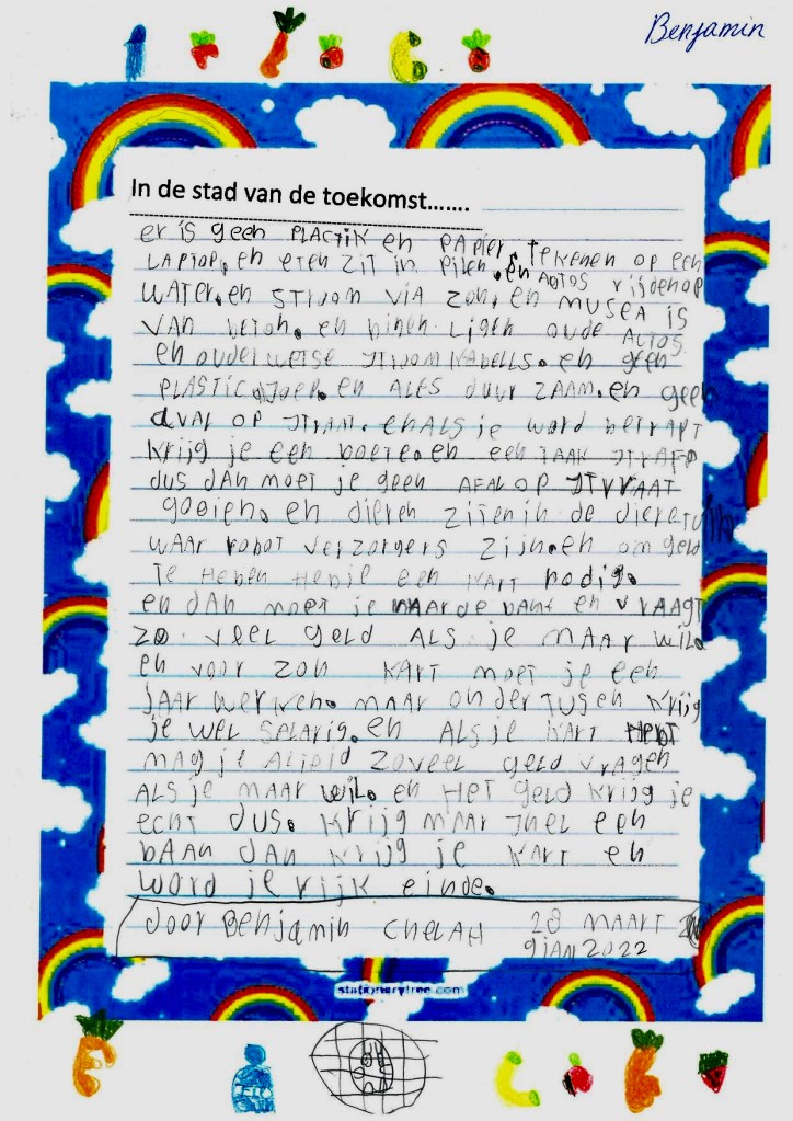 5A schrijft erop los! 01/04/202202/04/2022 | Kunstjuf Er werd volop creatief geschreven door 5A deze week. Bij een beginzin mocht iedereen zijn eigen verhaal schrijven. Hele A4-tjes aan prachtverhalen, sommige ook met ware kennis en veel humor rondom het klimaatprobleem! Dit delen: Delen op X (Opent in een nieuw venster) X Share op Facebook (Opent in een nieuw venster) Facebook Vind-ik-leuk Aan het laden...