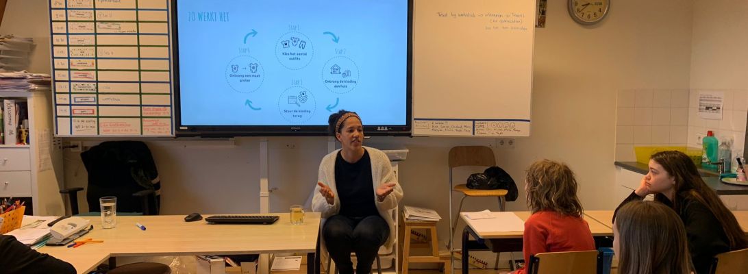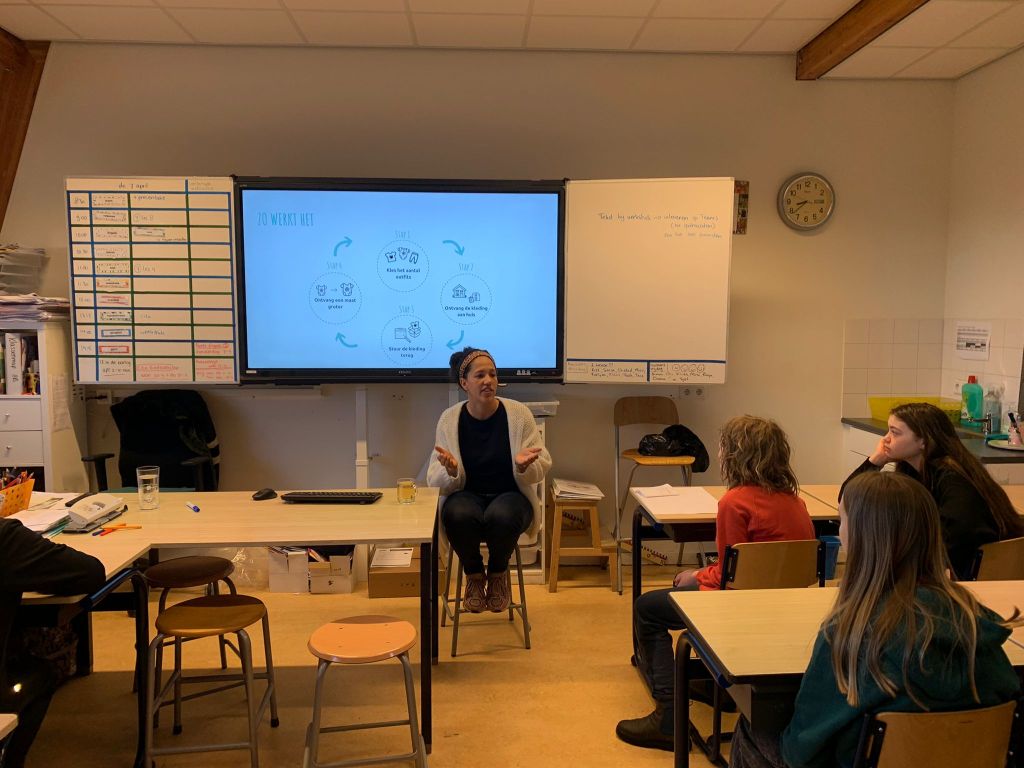 De groepen 8 kregen vanochtend bezoek van Puck Middelkoop, mama van Lux uit 3A. Puck heeft het bedrijf Hulaaloop, dat zich richt op de circulaire economie. Ze verhuurt baby-/kinderkleding, want wisten jullie dat kleintjes tot de leeftijd van 2 jaar wel 8 verschillende maten doorlopen! Bij haar kleding lenen scheelt dus heel veel overtollige babykleding….zo’n goed idee!